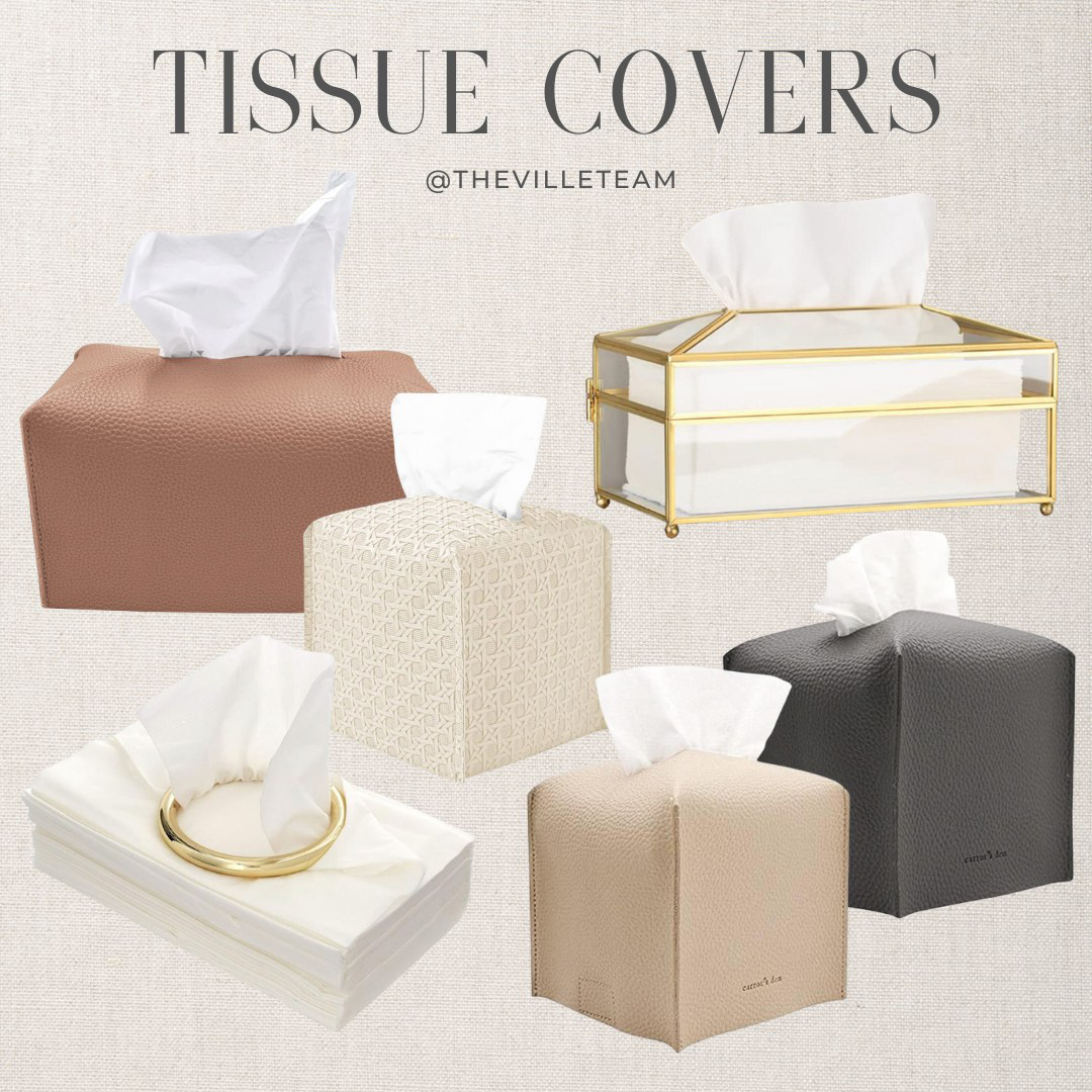 Leather Rectangular Tissue Box Holder | Glass & Brass Tissue Box | Rattan Cane Weave Square Tissue Box Holder | Ring Tissue Dispenser | Beige and Charcoal Pebbled Leather Tissue Box Cover