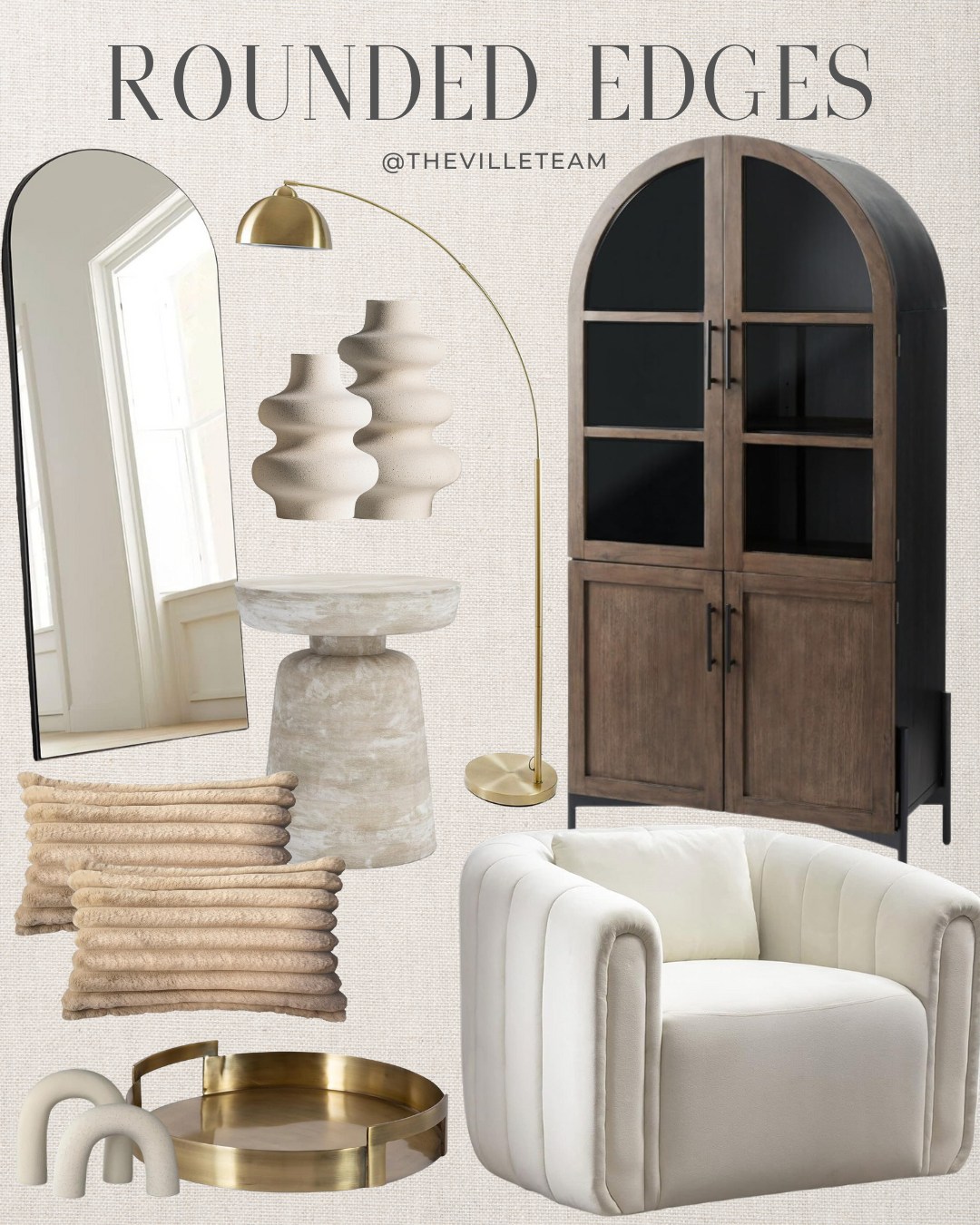 Standing Mirror | Ceramic Vase Set | Floor Lamp | Arched Display Cabinet with Doors | Side Table | Throw Pillow Covers | Arch Decorative Objects | Round Brass Tray | Modern Swivel Barrel Chair