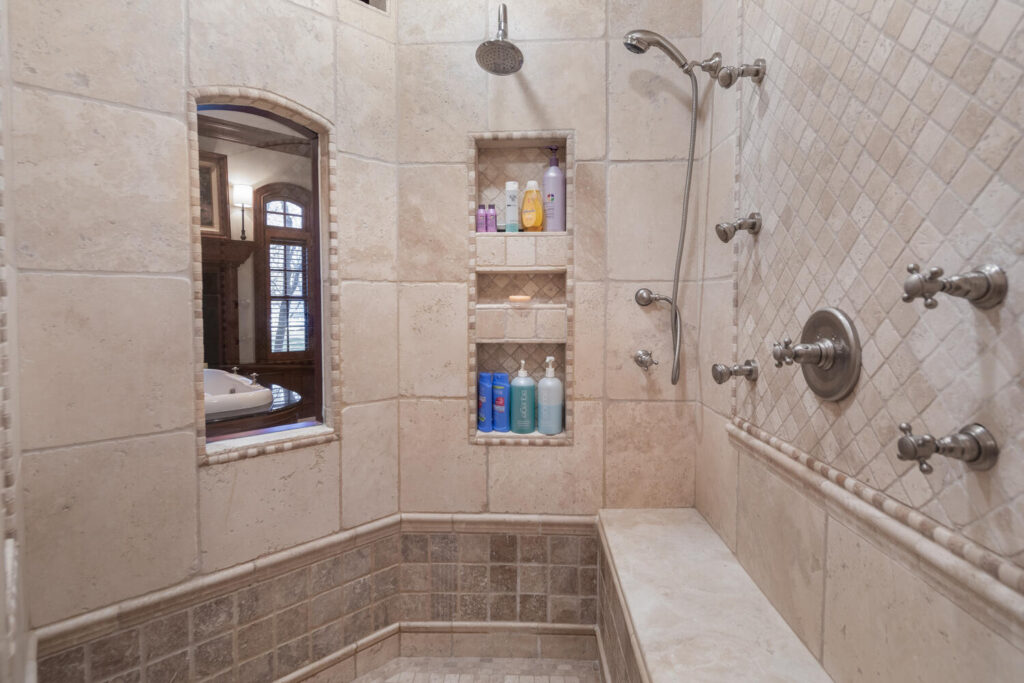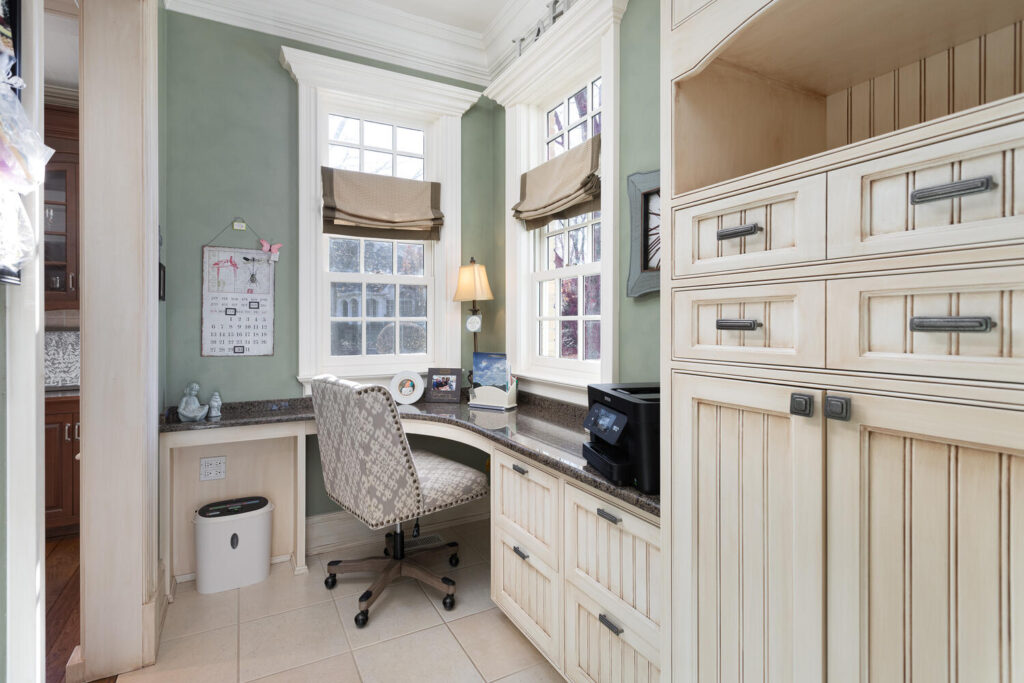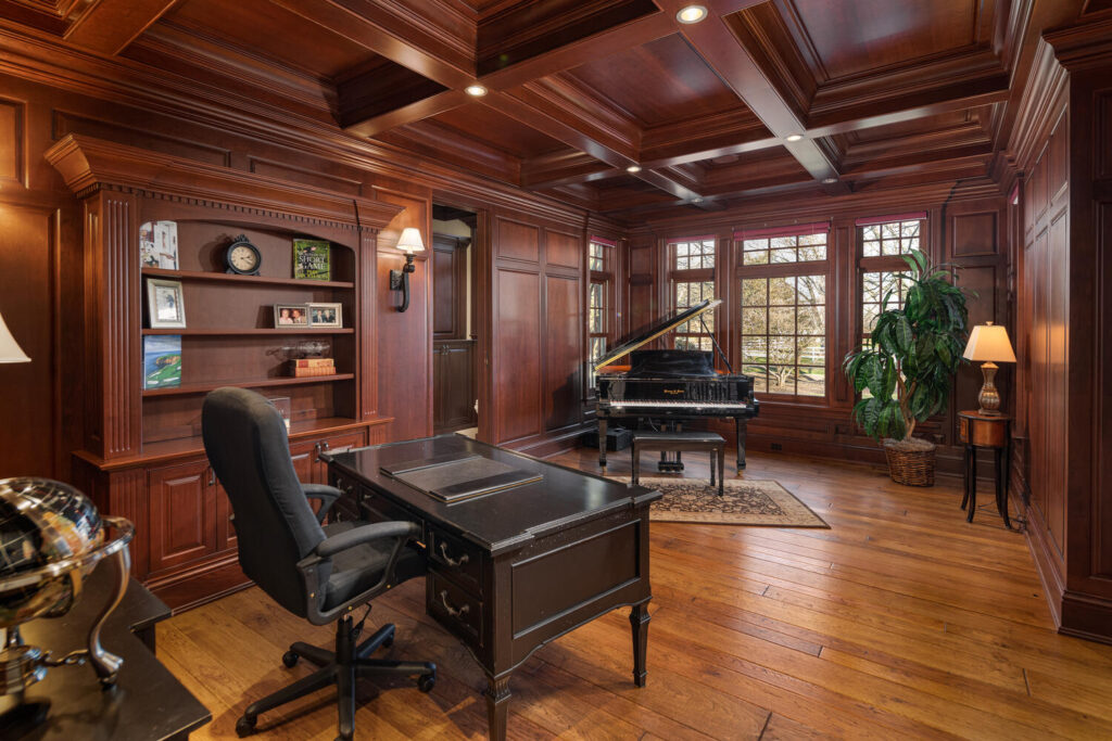 The heart of the home is the high-end gourmet kitchen with European washed and dark accent maple custom cabinetry. The oversized island and separate eating area are perfectly placed near the stone fireplace. First floor primary is privately located in the west wing with gorgeous views of the koi pond. High-end closets, exquisite primary bath with custom cabinets, steam shower and deep soak tub, in front of wood-surround fireplace. First floor office with a rich cherry paneling and cherry coffered ceiling includes a secret door to a full bath that can be easily used as an additional bedroom. The dramatic main staircase has floor to ceiling windows and continues from the upstairs directly to the basement.