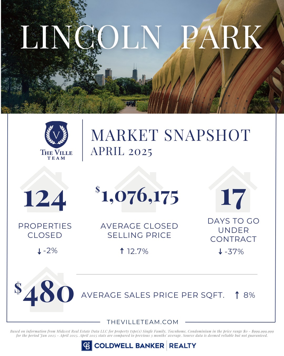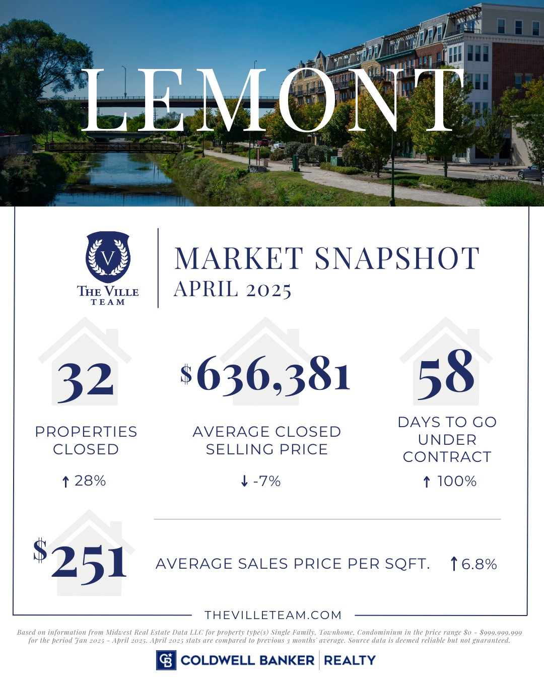 *Based on information from Midwest Real Estate Data LLC for property type(s) Single Family, Townhome, Condominium in the price range $0 – $999,999,999 for the period Jan 2025 – April 2025. April 2025 stats are compared to previous 3 months’ average. Source data is deemed reliable but not guaranteed.