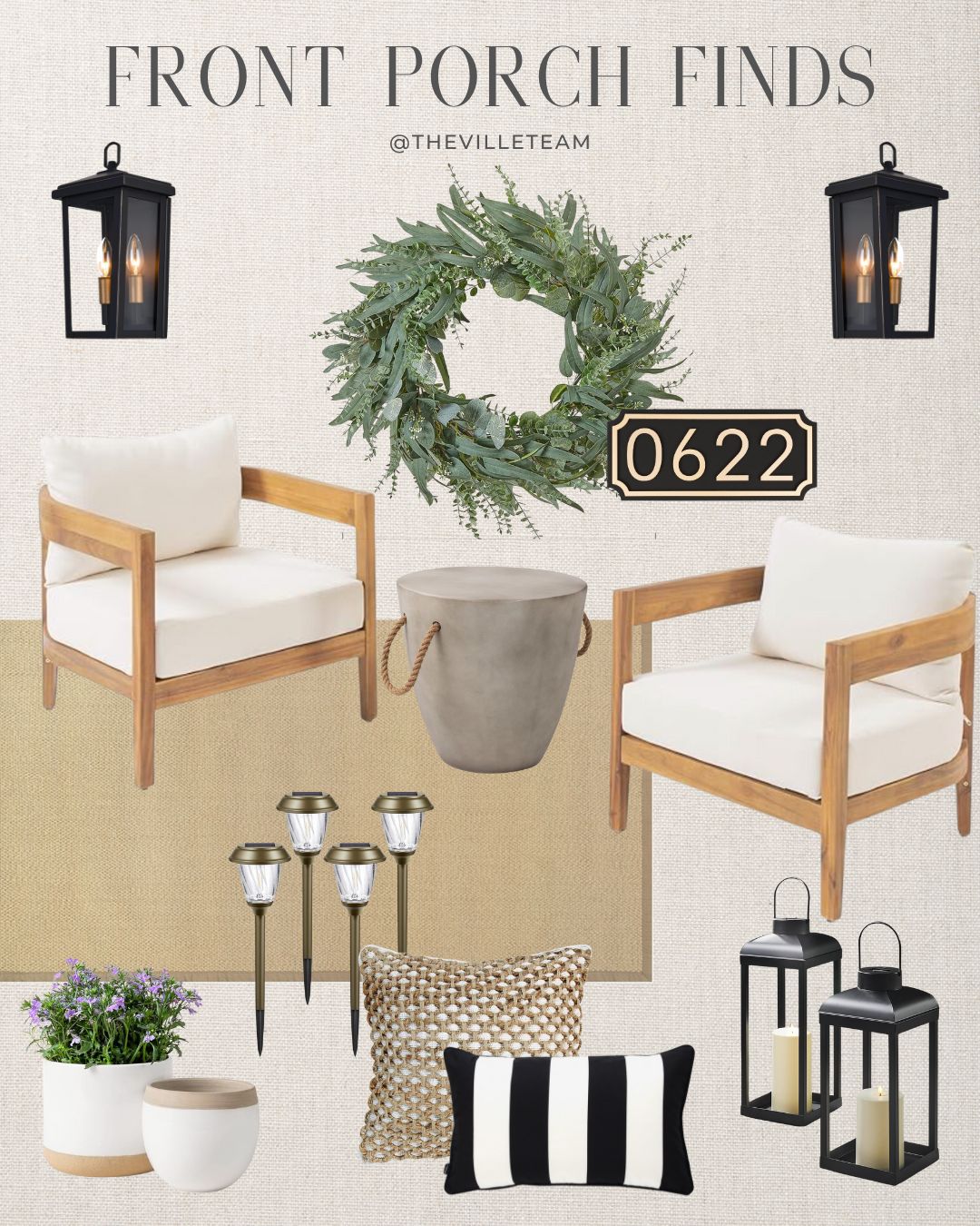 Indoor/Outdoor Area Rug | Eucalyptus Greenery Wreath | Outdoor Patio Light Fixtures | House Number Plaques | Teak Outdoor Club Chairs with Cushions | Concrete Outdoor End Table | White Ceramic Flower Plant Pots | Pathway Solar Lights | Outdoor Jute & White Throw Pillow | Black & White Stripe Lumbar Pillow Cover | Solar Powered Outdoor Lantern – 15 inch | Solar Powered Outdoor Lantern – 18 inch