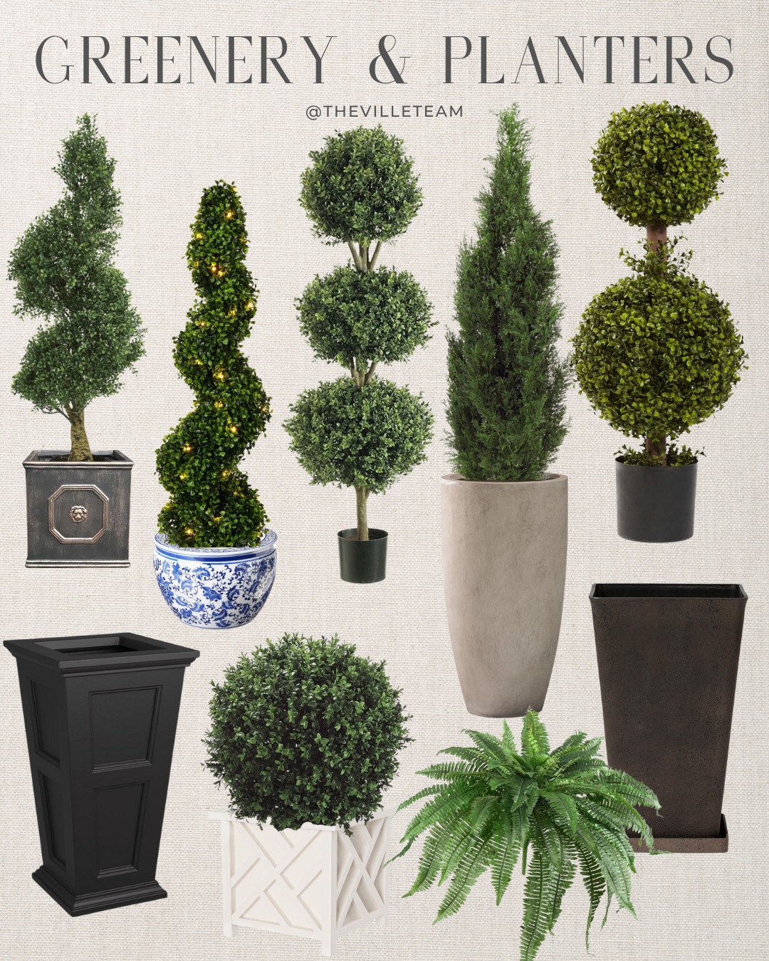 Spiral Boxwood Artificial Tree (far left, top) | Square Lion Head Concrete Planter | Pre-Lit LED Artificial Boxwood Topiary Spiral Tree | Floral Blue & White Porcelain Fishbowl | Triple Ball Boxwood Topiary Tree | Faux Cedar Tree | Tall Concrete Planter | Artificial Double Boxwood Topiary Ball Tree | Tall Black Planter (far left, bottom) | Ball Shaped Boxwood Topiary | White Lattice Flower Box | Faux Fern | Weather Resistant Tall Outdoor Planter
