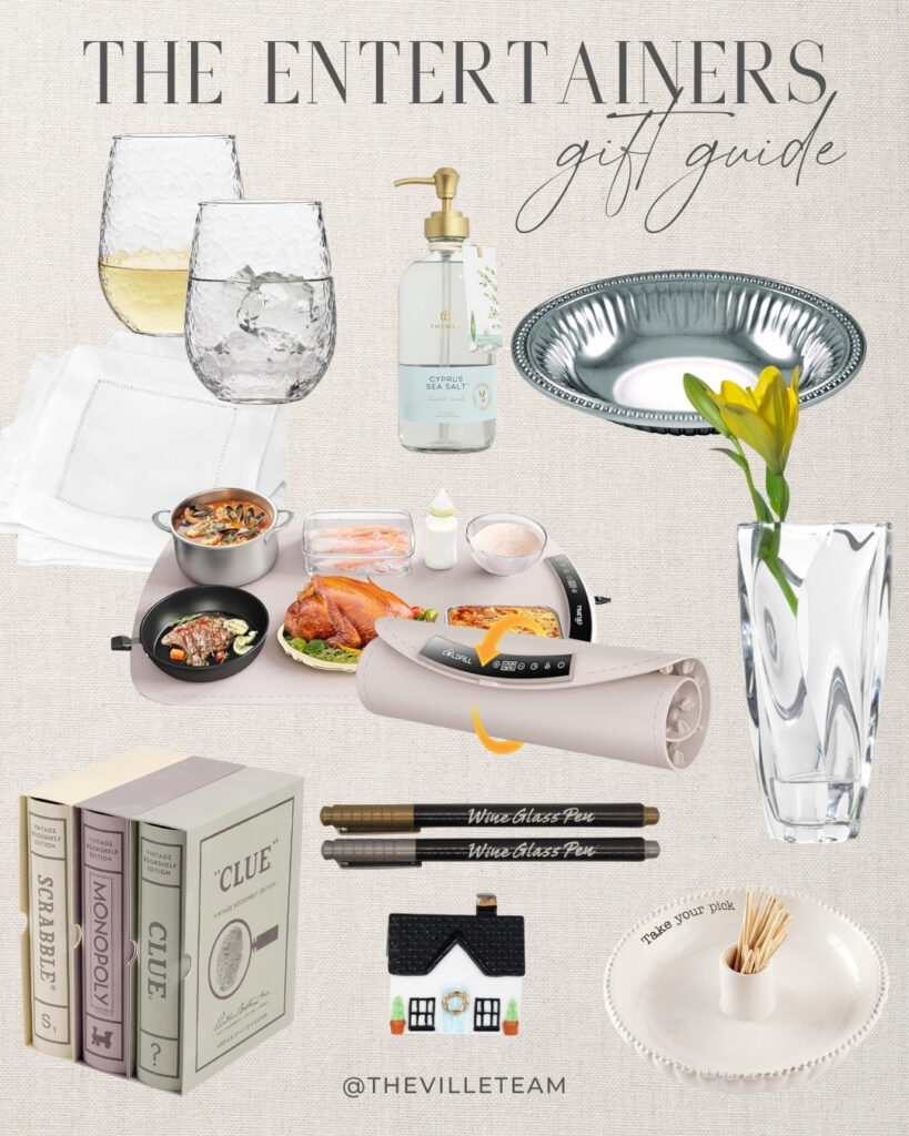 Hammered Stemless All-Purpose Wine Glasses | White Linen Hemstitch Cocktail Napkins | Thymes Hand Soap | Wilton Armetale Medium Oval Serving Bowl | Electric Warming Mat | Crystal Glass Vase | Scrabble, Monopoly, and Clue Vintage Board Game Bookshelf Collection | Erasable Wine Glass Marker Pen Set | Nora Fleming House Mini | Take Your Pick, Toothpick Dish