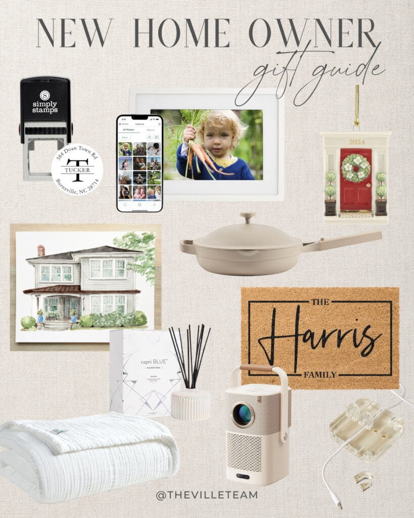 Custom Round Return Address Stamp | Digital Picture Frame – WiFi Enabled with Load from Phone Capability | Lenox New Home Ornament | Always Pan | Hand-Painted Home Portrait | Custom Welcome Mat | Linen Throw Blanket | Capri Blue Volcano Reed Diffuser | JBL Indoor / Outdoor Projector | Acrylic Cable Manager