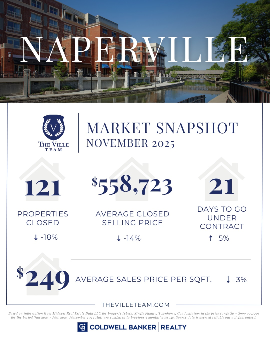 The Month’s Supply of Inventory (MSI) for attached and detached homes in Naperville for November 2025 went down to the 1.4 Month’s Supply of Inventory mark from 1.6 MSI in September. In Naperville, there were 165 attached and detached homes available for sale. And, we had 121 homes close. The average sales price in November 2025 was $558,723, down -12% from November 2024. The average selling price per square foot was $249. And, the average days on market went up slightly to 21 days.